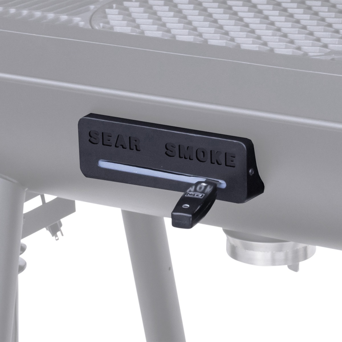 There is a heat baffle on every pellet grill to distribute heat for indirect cooking. A special baffle on the Rider DLX allows users to switch between cooking modes for smoking or searing. Sliding the SEAR SMOKE selector to SEAR mode opens the heat baffle, giving the heat a direct path to food. Contrastingly, sliding it over to SMOKE mode closes the heat baffle for cooking with indirect heat. If you set the selector somewhere in between SEAR and SMOKE, you partially open the baffle to cook with more options than entirely open or entirely closed.